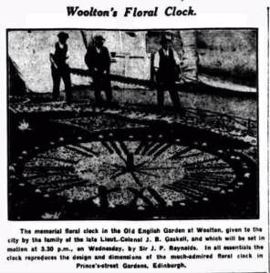 The clock which was based on the same design as the one in Edinburgh, was presented in memory of by the family of Lt Col James Bellhouse Gaskell. It carried the inscription”Precious moments, golden hours, told by cuckoos and with flowers”, one of a s series of rhyming floral quotations which adorned the feature in bedding. These were devised by Harry Corlett, the Gaskell’s head gardener, who stayed on and continued to develop the garden as a municipal park. It opened in July 1921 to the claim it was ‘the finest garden in the city’.