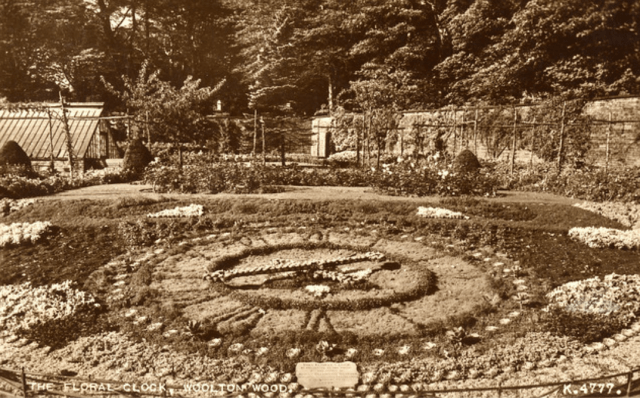 Almost all of the floral clocks I’ve found were in public parks and paid for out of public funds. But of course everyone likes a bargain or a free gift so when, in 1926, Liverpool City Council was offered one for the former walled kitchen garden at Woolton Wood they were delighted. For many years the Woolton estate had been owned by the Gaskell family, who were prominent local industrialists as well as keen gardeners and plant collectors. In 1917 the grounds were bought by the city council for a park with the walled garden being opened to the public in 1921 as an Old English Garden.