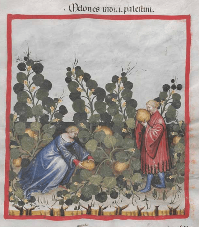 One relation of the gourd gets a special mention. The melon is “another type of vine that creeps boldly across the dusty ground and bears round fruits. These lie mainly on the dry ground, ripening in splendour and turning the colour of the sun before filling the gardener’s baskets with a rich bounty.” These fruit are varied in shape some “rather slender …while others are quite long and have a thick belly, like a nut or rounded egg. They look like shiny bubbles clinging to your hands as you rub some soap, before the fresh foam disappears in the running water.” When cut “lots of seeds and rivers of juice low forth” so divide the hollow fruit into several pieces by hand and your happy guest will receive a tasty delight straight from the garden.”