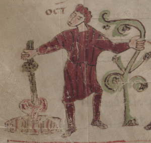 Spring leads to summer and in the next section Walafrid encounters the difficult problem of watering. Remember there were no hosepipes, taps or even watering cans, although there simple thumb pots and of course the bucket that Walafrid uses. [For more on this see an earlier post]