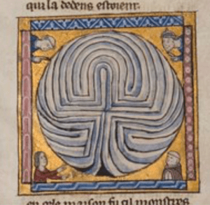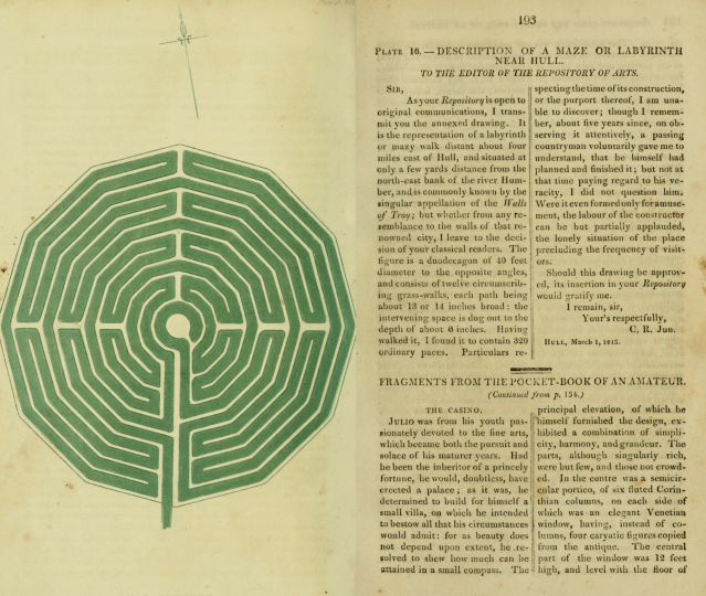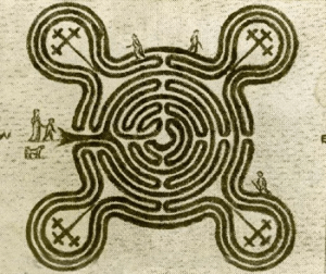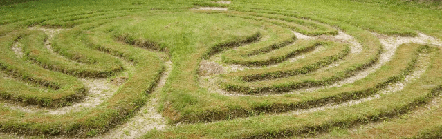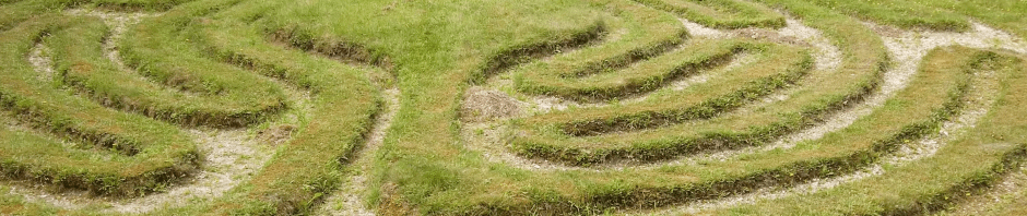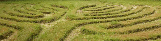 At the risk of confusing you before we start properly,  is there a difference between a labyrinth and a maze? The answer is yes, with most authorities  probably accepting  that while the terms are often used interchangeably,  a maze is  designed as a puzzle, designed to confuse with plenty of choices, some of which lead to dead ends and only one leading to the centre. A Labyrinth on the other hand has  just one path, albeit convoluted, to the centre.  To use the right technical jargon, a maze is multicursal and a labyrinth unicursal.  To make matters more confused in England both have always been called mazes, from the same Old English root as ‘amaze’ – meaning to astonish or bewilder, which is exactly what they do, so perhaps in real life it doesn’t matter that much.