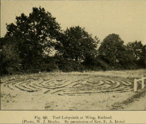 There are 3 other turf mazes with similar designs to  Chartres, apart from Julian’s Bower. There are the earthwork remains of another circular medieval turf maze  near the parish church at  Wing in Rutland.   This one has 11 circuits cut into the turf in a cross-shaped pattern, and probably once  surrounded by a low bank.