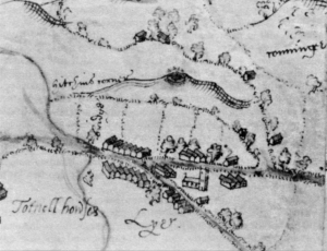 There’s another mizmaze on a low hill overlooking the village of Leigh in Dorset, although not much remains apart from some hexagonal earthwork banks and a slight central mound.  The design has long disappeared  but can be at least guessed for depictions on a series of early maps. The earliest of these is to be found on an Elizabethan map of the manors of north Dorset (BL Add MS 52522] dating from 1569-74. Although the drawing is tiny it is clearly realistic and shows it as two concentric ovals linked by a central cross.
