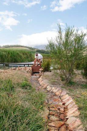 The paddy was excavated and levelled, with channels built to bring water from the stream and sluices installed to control the flow. Rice is thirsty so the paddy needs watering every morning and evening with sprinklers until the rice plant is 6-8″ high then the field is flooded knee deep and kept like that until autumn when the water is stopped and the plants allowed to dry up before the grains are harvested. There are a lot more photos and an account of how this was done on the Babylonstoren blog.