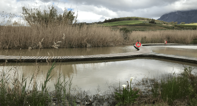 The path now meanders through trees and uncultivated land before arriving at a huge wetland area with a walkway across the water. This was constructed in 2009 as part of a wastewater treatment system, but it also allows for the recreation of suitable habitats for indigenous flora and fauna. [If you’re interested in its effectiveness at removal pollutants you might like to look at the work of Vanessa Lakay of the Department of Environmental and Geographical Science at Cape Town University.]