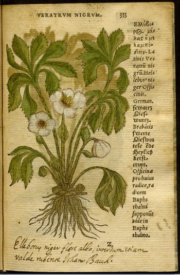 On a more mundane level Ground up finely hellebore was added to snuff because it can cause sneezing, thought to ward off evil spirits, and which probably accounts for another old German nickname Nieswurz, or  “sneezewort” which you  can see in the text of the image from Dodoens above.