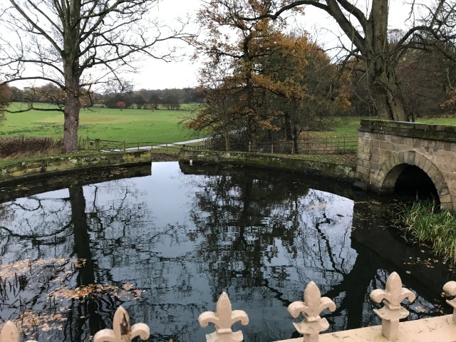 The Middle Lake, with the main road crossing Nostell Bridge in the distance. The Upper Lake is on the other side of the bridge