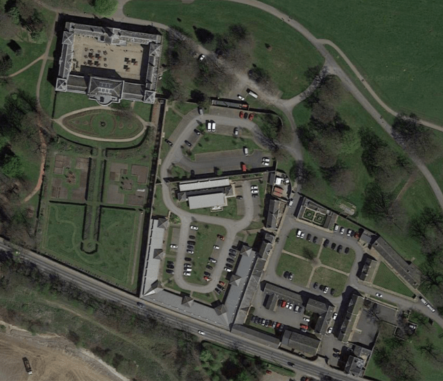 Stable block top left, with the formal gardens in front adjoining the former walled kitchen gardens and estate yards which are now a business park