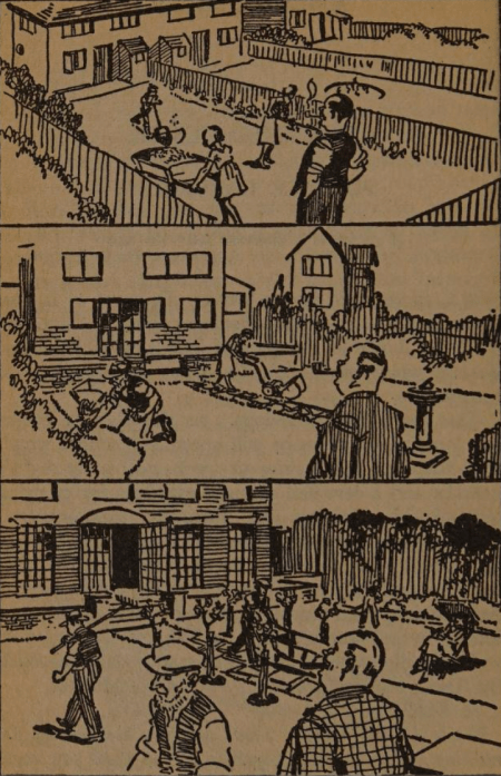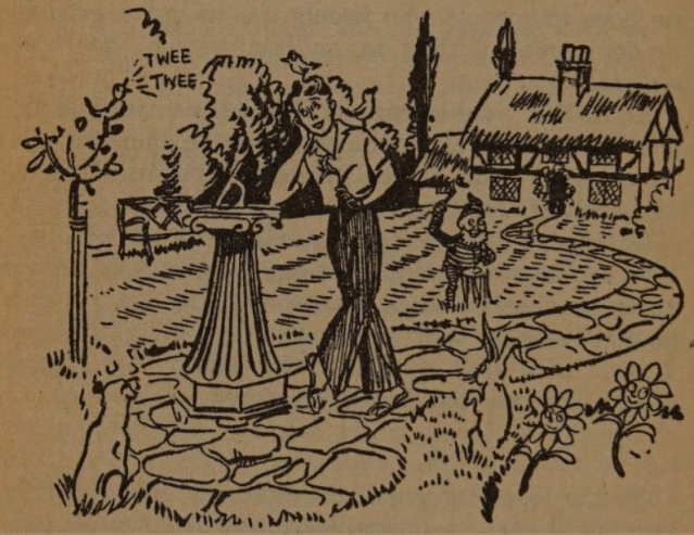 “You will certainly require herbaceous border, a lawn, a box-hedge, a rosery, a gravel path and a rockery.” But that’s not all and this list goes on to cover the rest of the page and the whole of the next one because” it is usual nowadays to have a crazy pavement, a sundial, some terracotta dwarfs and a Flagstaff, or at least a pole for the wireless.” And then of course ” your wife will demand a kitchen and garden, an orchard, a garden seat, a sandpit for the children and a lovely goldfish pool with waterlilies.” and so on and so on including amongst many many other things, a pagoda, a pleasaunce, an Unpleasaunce, monkey-puzzle, vinery, tool-shed, a lotus-grove, a statue of Peter Pan and a Primrose Path.