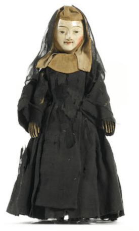 The Swarbrick Nun” a rare English wooden doll c.1680 which has many similarities to other examples of wooden dolls of this period, although she is not as well dressed as Lord and Lady Clapham in the V&A Sold at Bonhams for £30,000 in 2009