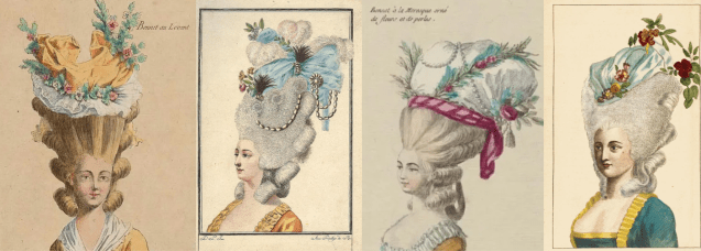 What he doesn’t mention is the extraordinary hairstyles and head-dresses, which often included flowers, that appeared at the court of Louis XVI and Marie Antoinette in the 1770s and 1780s. The most bizarre known as “poufs,” had the victim’s hair stretched over gauze, stuffed with padding, and perhaps with false hairpieces attached. These were invented by Rose Bertin, Marie Antoinette’s dressmaker and her hairdresser Léonard Autié. Similar styles could also be seen in fashionable circles in London as I showed in an earlier post about Matthias Darly who satirised them mercilessly.