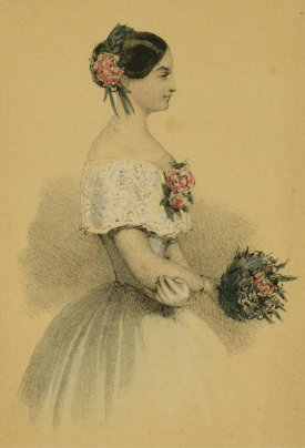 “At the present day there is an evident inclination to return to the better customs of Greece and Rome, and no fashionable lady can present herself respectably at a ball or an evening party without having a Rose or a Camellia in her breast. Let us hope that in a short time the crown and the bouquet will be rigorously enforced in every reunion which has pleasure for its object.