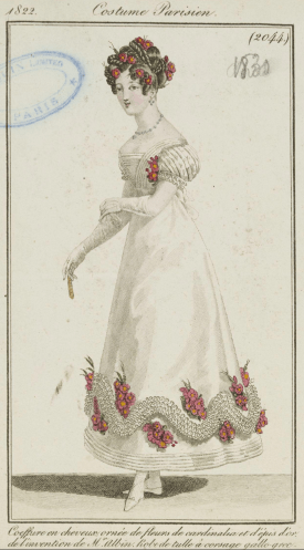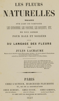 Evidently politically astute Lachaume honours the restored monarchy with a renewed love of flowers and floral ornaments, praising the aristocratic ladies who supported the Society, but adds that it was then that the vogue for artificial flowers started. He claims everyone wore them, from the peasant woman, with her bonnet covered in cheap showy stuff right up to the duchess, who preferred velvet roses to real ones.