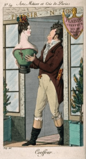 He is usually very specific about how the style should be worn and the flowers that suit it. The Coiffure a la Ceres, illustrated above, for example, ” is normally worn with a headband.. it is very graceful, but suits only the people who have a well proportioned head…and should always form a tiara before the height of the forehead. It should be braided beforehand with small pink flowers or small camellias, with violets, marguerites, or carnations. Heather or a very light foliage is an essential accompaniment.”