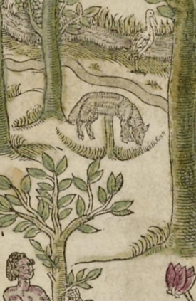 The most often reproduced image of theLamb is the one below, often said to be “by Mandeville”, “from Mandeville” or “after Mandeville” and usually dated around 1350-1370. In fact it’s a copy redrawn and modified by Lee for his book and taken from the 1481 version of The Travels printed in Augsburg [see above].