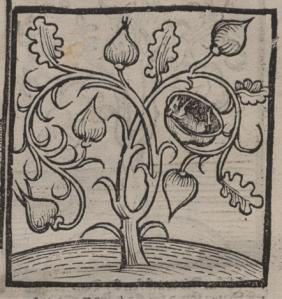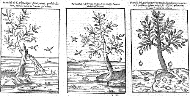 Different versions of the story have different ideas about how the geese were created. But it’s the images in Claude Duret’s Histoire admirable des plantes, of 1605 which provide the widest range. On the left is a tree which had seed pods that contained birds, while in other versions they didn’t hatch until the fruit fell to the ground. To make matters more interesting there were also trees where if fruit fell into water they hatched into fish, rather than birds. Sometimes the tree had to be in a state of decay before it released birds and also worms.
