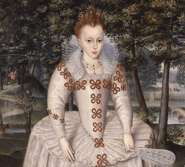 Another woman is prominent in the history of another converted monastic site, Coombe Abbey in Warwickshire. She wasn’t the creator but instead the subject of a portrait which includes part of the garden and parkland in the background. And she’s yet another Elizabeth! Princess Elizabeth was the daughter of James I and Anne of Denmark and as was customary her education was farmed out to a respectable courtier. In her case it was Sir John Harrington who lived at Coombe. Luckily Elizabeth’s stay was recorded by one of her ladies in waiting, so that we know “her Garden and Green house, were as well stored with Curiosities, and exotic Plants, as her Minagerie, with Creatures.” In particular the princess was very fond of birds and had an aviary built with a rustic cottage for “a poor widow and her children” to live in, “take care of the different sort of Fowls that were-to be kept there. The garden also had a grotto “the Adorning of which with Shells and Moss, was the Amusement of many of her leisure Hours” and the extraordinary treehouse on a spiral mount that can be seen on the left in her portrait.