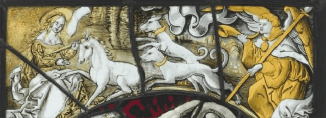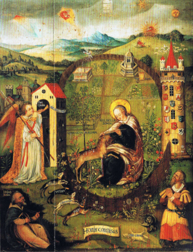 Last week’s post ended with this rather strange picture of the Virgin Mary sitting in a garden with a unicorn in her lap and the Angel Gabriel dressed as a hunter chasing after it with dogs.