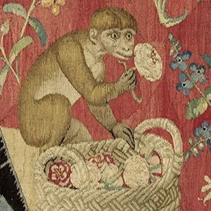 Each tapestry has a quite static posed scene which includes a beautifully dressed young woman and her servant, together with a lion and a unicorn, often holding banners, and often others animals including a monkey. They all stand in a flower-filled enclosed garden demarcated in dark green and against an unusual bright red background that is covered with an almost hypnotic pattern of plants, birds and animals.