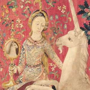 Sight – the lady holds a mirror for the unicorn to gaze at his own reflection