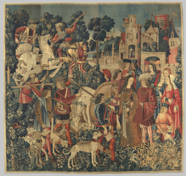 The next scene is chaotic and shows the hunters attacking the unicorn who, wounded, tries to escape by leaping across a stream. The ferocity of the battle is conveyed by the converging lances aimed at the animal, the sounding of the hunting horns, and the menacing hounds. The whole resembles depiction of stag hunts – a pursuit reserved for the elite – and has palatial buildings in the background.