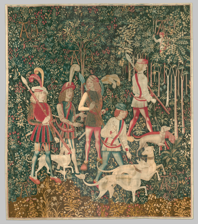The first panel which shows the start of the hunt is set, like the Lady and the Unicorn series, against a millefleurs background, this time in dark green speckled with trees and flowers. As many as 101 different species of plants can be seen in the series, 85 which have been identified, including the cherry tree behind the hunters and rather surprisingly a date palm which can be seen in front of the sniffing hounds in the bottom right just above the A & reversed E.