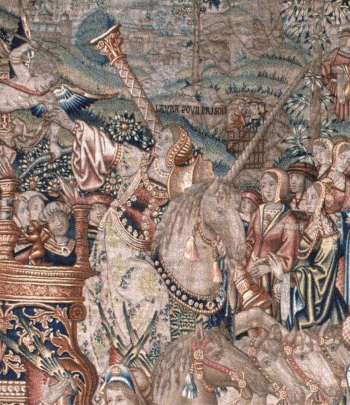 As material objects, they are quite breathtaking. Probably woven in the southern Netherlands from extremely high quality wool and silk they would have cost a fortune to produce, and imply royal or extremely wealthy patronage. The banners that appear throughout the series carry the arms of the Le Viste family who presumably were the commissioners. But why they should have spent so much and what was being celebrated is unclear.