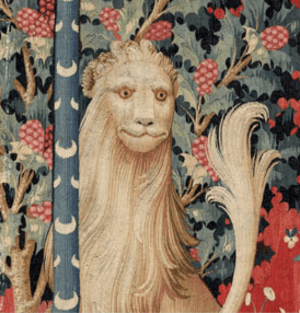 Above her head is embroidered the motto “À Mon Seul Désir”, the exact meaning of which is unclear, although which can be literally translated as “to my only/sole desire”, “according to my desire alone”; or perhaps “by my will alone.”