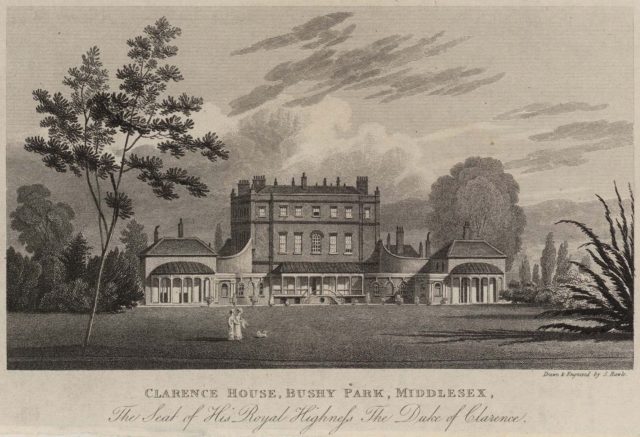 After a year or so living in Hanover, where George IV was also king, the newly-wed Duke and Duchess of Clarence returned to London. They lived between Clarence House, which was newly built for them by John Nash, and Bushy Park, where the duke held the post of Ranger. Their lifestyle was so quiet and simple that observers thought them parsimonious. They remained in comparative retirement until with the death of George IV, 26 June 1830 the Duke ascended to the throne as William IV, and his wife became Queen Adelaide.