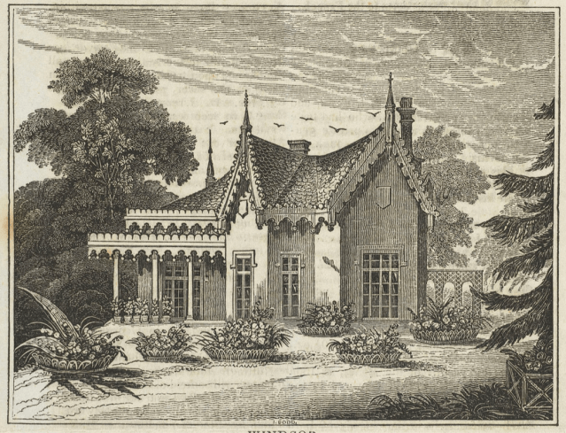 Yet in her own grounds Adelaide does seem to have taken great pride. Just after she became queen William had a small house built for her in the grounds of Windsor Castle. It was used rather like Queen Charlotte’s cottage in the grounds of Kew, as a private retreat and for tea-parties and excursions with friends. Now known as Adelaide Cottage it was designed by Jeffry Wyattville in the picturesque style. Described At the time of construction in 1831, as “chastely elegant” with two “public rooms”, a retiring room for the queen, and a pages’ room. “It has none of that obtrusive splendour which characterizes palace-building, but much of the quaint elegance of the embellished order of domestic architecture in the Old English school. In short, this unostentatious little building must altogether be considered complimentary to Her Majesty’s taste.”One interesting thing to note about the garden is the early use of Hardenburg baskets. These take their name from the Prussian statesman Karl August Hardenburg whose Klein-Glienicke estate outside Berlin was visited by the English architect John Adey Repton(son of Humphry ) in 1822. One feature he admired were baskets made of wooden trelliswork which were used as to hold roses bushes, and when he returned he began to use them in his own designs.