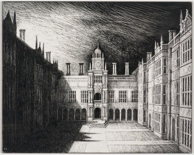 Sadly there is no surviving documentary evidence for the contsruction and there are no contemporary images, apart from the thumbnail sketch on Treswell’s two surveys so we have to make do with artists impressions based on later drawings of the ruins. The exact appearance of the house has been analysed in detail by Mark Girouard in two Country Life articles – October 17th and 25th 1979- from which it has been deduced that it was in large part symmetrical with mullioned windows, bay windows and two-storeyed open arcading on the garden front.