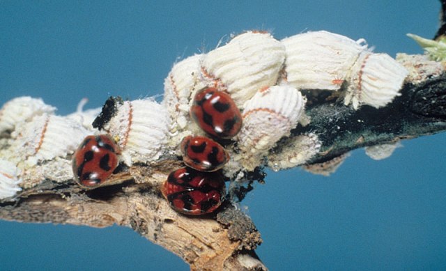 The second major import was in response to a major crisis. In the late 1860s a pest called cottony-cushion scale, [Icerya purchasi] was discovered in California the home of a new and rapidly growing citrus growing industry. It spread rapidly and attacked citrus trees almost to the point of destruction. Government entomologists began to work on its control and sent a parasite collector, Albert Koebele to Australia where it was thought the scale had originated. It was quite rare there because, as he eventually discovered it was kept in check by the vedalia beetle, a variety of ladybird [now technically as Novius cardinalis ]. Larvae were imported and the scale insect became the first pest to be beaten by importation of a natural enemy, and saving the California citrus industry in the process.