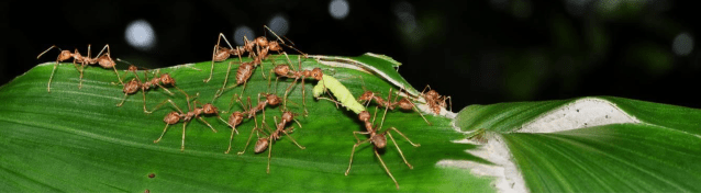 A group of weaver ants bringing a green noctuid caterpillar back to its aerial nest