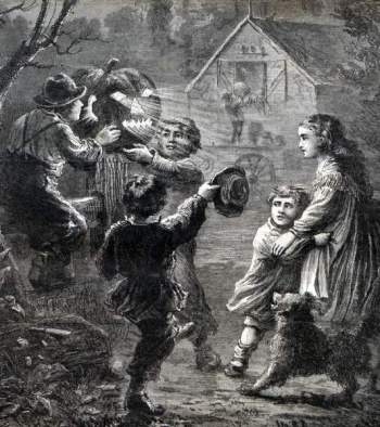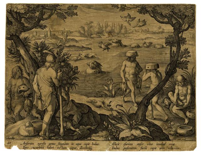 Indians Catching Ducks with Pumpkins, 1596 the hunters submerge themselves in the water wearing carved out pumpkins on their heads, if/when the ducks land on them they can then be caught