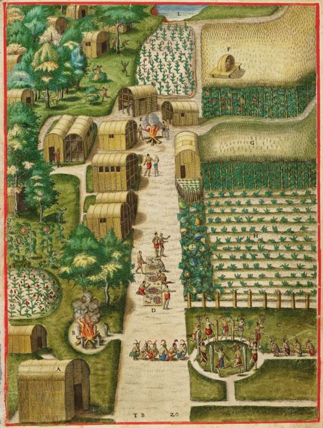 The engraving is based on a water colour by Captain John Smith the leader of the Roanoke expedition and its shows three fields of maize growing along the right side of the image. In the topmost field there’s a watchman in a hut on stilts to scare birds away. There are also fields of tobacco (top centre), some sunflowers and a large pumpkin patch containing several different sorts.