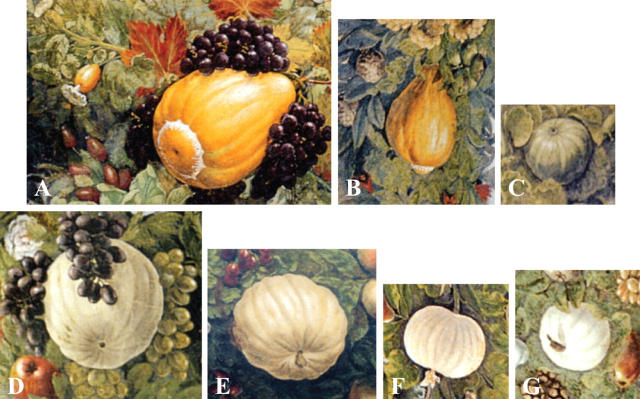 Squash from the Villa Farnesina ceiling, by Giovanni da Udine, 1515-1518 Cucurbita maxima (pumpkin): (A and B) orange show pumpkin; (C) grey pumpkin; (D–G) white show pumpkin. Caneva (1992b) classified (A) and (B) as Cucurbita moschata, (C) as Citrullus colocynthis and (D)–(G) as Cucumis melo var. inodorus.