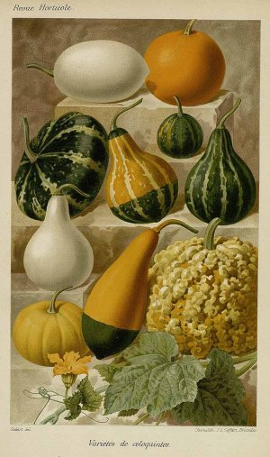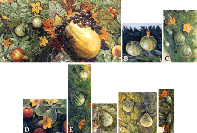 Squash from the Villa Farnesina ceiling, by Giovanni da Udine 1515-1518 Cucurbita pepo (pumpkin, gourd): (A and B) pumpkin group; (C–H) oviform and pyriform gourds. Caneva (1992b) classified (A) as Cucurbita maxima and (B)–(H) as C. pepo.