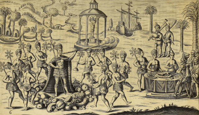 Another sign of their importance can be seen in this 1621 engraving where fruits of all kinds, including several sorts of squash, surround the local chief while his people prepare a feast for the Spanish. Incidentally the word squash derives from the Narragansett language word, askutasquash, which rather surprisingly meant “eaten raw or uncooked.”