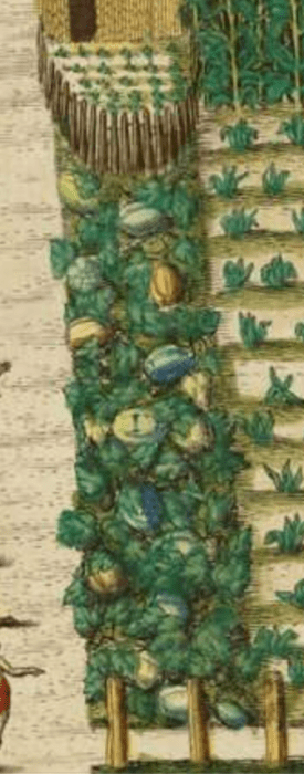 According to Harriot, the Algonquians used a single term, macocqwer, for what he called “Pompoins, Mellions, and Gourdes” although of course there were no melons in the Americas at this time. In 1584 another early visitor Arthur Barlowe had already mistakenly described some kind of squash as cucumbers, although they too had not really reached the Americas by this time.