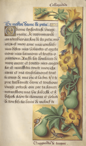 In the earliest depiction of any American squash the plant appears in the private prayer book of the French queen which was painted between 1503 and 1508. You’ll see they are described there as quegourdes de turquie implying that they came from Turkey. Quegourdes was a term the name given to European gourds [now technically Lagenaria] but because this new plant was recognised as being different it was given the label “Turkish” a generic term used for many new exotics.