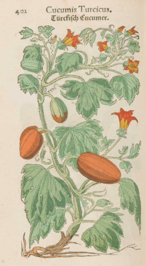 For example, one of the two C. pepo pumpkins appearing in Leonhard Fuchs Herbal of 1542) is labelled “Turkish cucumber” (‘Türckisch Cucumer’) while maize is described as “Turkish corn” (‘Türckisch Korn”) although both are native American plants.