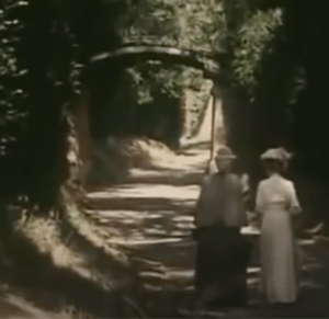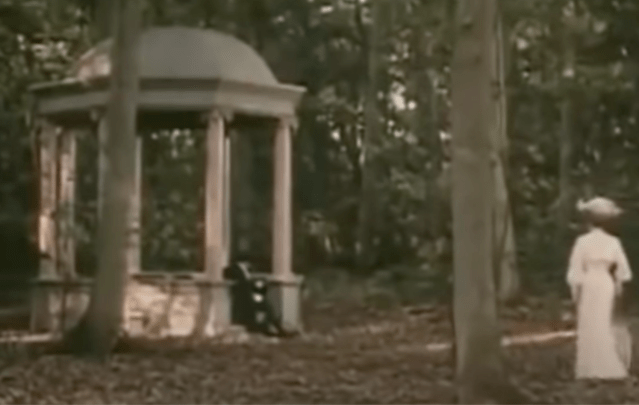 While she was puzzling about that, more strange figures appeared: “a man, cloaked like those we had seen before, slipped swiftly through the line of trees His movement attracted my attention because it was remarkable. He seemed to be among the trees, and yet the straightness of his course suggested that they were independent of one another.”Next she “heard a rustling behind which made me wonder why people in silk dresses came out on such a wet day; and I said to myself, ‘just like French people’. I turned sharply round to see who they were, but saw no one, and then all in a moment I had the same feeling as by the terrace in the summer, only in a much greater degree; it was as though I were closed in by a group of people who already filled the path, coming from behind and passing me. At one moment there seemed really no room for me. I heard some women’s voices talking French, and caught the words ‘Monsieur et Madame’ said close to my ear. The crowd got scarce and drifted away, and then faint music, as of a band not far off, was audible. It was playing very light music with a good deal of repetition in it. Both voices and music were diminished in tone, as in a phonograph, unnaturally.” She wrote down twelve bars of this music from memory afterwards and in 1907 showed them to an unnamed “musical expert” who said they dated from “about 1780.” You can hear it here