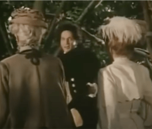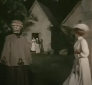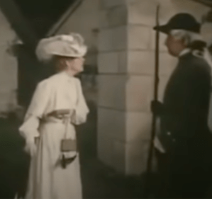 Miss Lamont then began to feel as if “something were wrong.” There were deserted buildings and soon there were unusual looking people too, including some who looked like figures “in a tableau vivant”. They asked directions from a pair of men they assumed were gardeners because they had a wheelbarrow and spades, but who perhaps were “really very dignified officials, dressed in long greyish-green coats with small three-cornered hats.”
