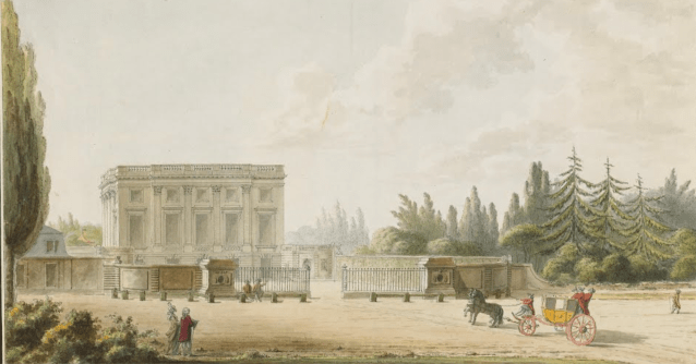 The Petit Trianon itself was “a square, solidly built small country house” with shuttered windows. “There was a terrace… and on the rough grass… a lady was sitting, holding out a paper as though to look at it at arm’s-length. I supposed her to be sketching.” She saw us, and turned and looked full at us… She had on a shady white hat perched on a good deal of fair hair that fluffed round her forehead. Her light summer dress was arranged on her shoulders in handkerchief fashion, and there was a little line of either green or gold near the edge… I thought she was a tourist, but that her dress was old-fashioned and rather unusual (though people were wearing fichu bodices that summer). I looked straight at her; but some indescribable feeling made me turn away annoyed at her being there.”