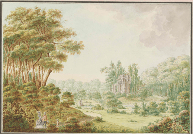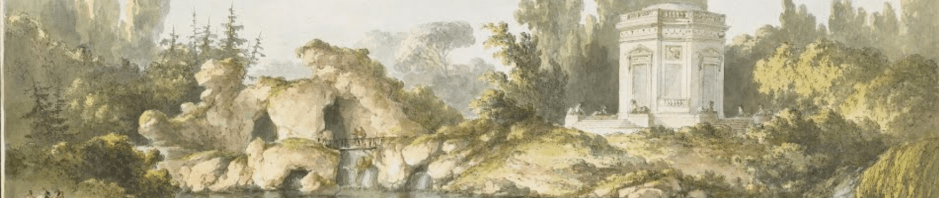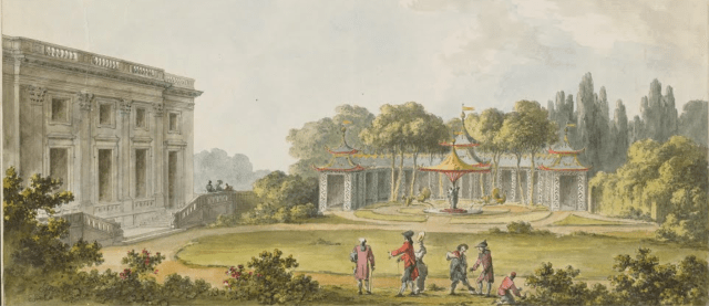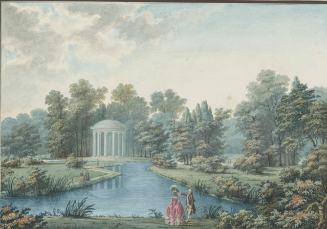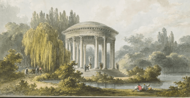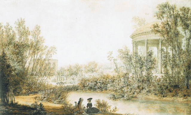 They both felt a sense of relief when a “red-faced” gentleman “tall, with large dark eyes, wearing “buckled shoes” that “made him look like an old picture” suddenly rushed up behind them, warned them away from the kiosk and gave them directions in oddly accented French, before running off again. Heading towards the Petit Trianon the two women “passed over the small rustic bridge which crossed a tiny ravine.” The path then led under trees, skirting “a narrow meadow of long grass …very much overshadowed by trees” which “gave the whole place a sombre look suggestive of dampness, and shut out the view of the house until we were close to it”.