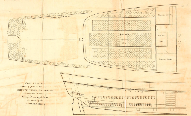 After a spell in merchant navy William Bligh was appointed to command the Bounty. You might have imagined this was a typical grand man o’war laden with guns and a big crew but in fact it was nothing like that. Instead it was, like both Resolution and Discovery a small converted collier [coal carrying ship] of just 215 tons. Nor was it heading off to war. Instead it was adapted as a floating greenhouse and sent to the Pacific to acquire breadfruit plants and take them to the Caribbean.