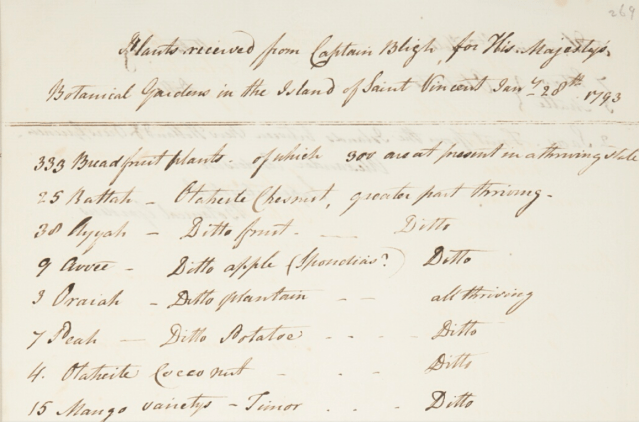 Providence’s voyage passed off without major problems but documents show how breadfruit was not the only plant being moved round the globe. Bligh called at the the newly established botanical garden on St Vincent and delivered a large number of plants and seeds that he collected on his voyage from Tahiti. These included 15 mangoes from Timor, coffee and almond trees from St Helena as well as plants from Tahiti itself. In return he picked up plants and the seeds of hundreds of tropical plants for Kew. [Click on the link in the images for a look at full lists ]