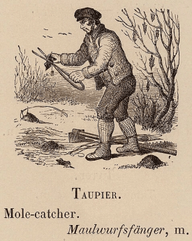 All of these anti-mole “remedies” and many more were collected together in a 1765 book delightfully entitled The Vermin Killer. However there wasn’t much by way of “new” methods throughout the 18th or early 19thc in Britain, and even the usually inventive John Claudius Loudon fails to devise an effective mole remedy. His Encyclopaedia of Gardening of 1825 has a drawing of a simple trap but no explanation of how it might work, and otherwise he merely suggest catching and destroying them as helpless babies in the spring.