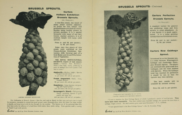 It really only in the second half of the 19thc that Brussels Sprouts became the subject of hybridisation. By 1888 Carters are offering the seed of 8 different varieties and that number remains roughly constant thereafter, and indeed today Thompson and Morgan are still offering 9 which given the drop in the number of varieties offered commercially for most vegetables is quite surprising.