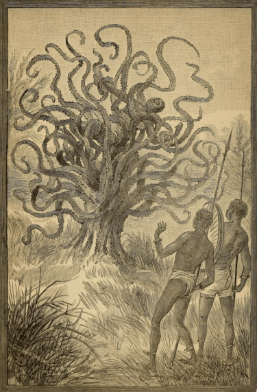Let’s have a look at what some of them have imagined. First up, in this catalogue of monsters, was just a couple of years after the appearance of the Madagascar man-eater in 1881. This time the plant is growing “in the central solitude of a Nubian fern forest.” Although the tree is nameless it is deadly. It stood alone and looked as if it would provide shelter from the heat of the sun, and bears “wondrous fruit”. Underneath it “a rank growth of grasses… concealed the fearful secret of the charnel-house within, and draw round the black roots of the murderous plant a decent screen of living green.” A European hunter and his African servant boy are following a herd of antelope but the boy runs close to the tree “and the next instant … The tree was convulsed with motion, leaned forward, swept its thick foliaged boughs to the ground, and …There was one stifled, strangling scream, and except for the agitation of the leaves where they had closed upon the boy, there was not a sign of life.”